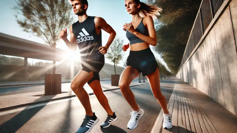 アディダスの最新ランニングシューズを履いて、爽やかな朝に一緒にランニングする若い男女