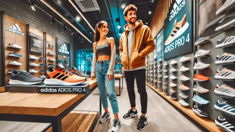 この画像は、20代の若い男女がアディダスの高機能ランニングシューズ「ADIOS PRO4」をスポーツショップの店頭で興味深く見ている様子を描いています。明るく清潔感のある店内で、シューズの機能やデザインを確認しているシーンは、購買意欲やライフスタイルの一コマとしても訴求力があります。実際に商品を手に取るリアルなシーンは、ECサイトやレビュー記事、ランニングギア紹介ページなど、幅広い用途に最適なビジュアル素材です。