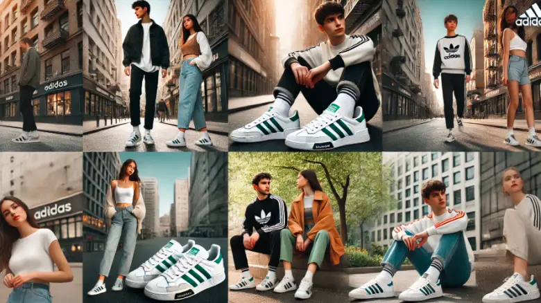アディダス アドバンコート(白×グリーン):20代の男女が都会の街並みでシンプルなカジュアルコーデを楽しむ様子。