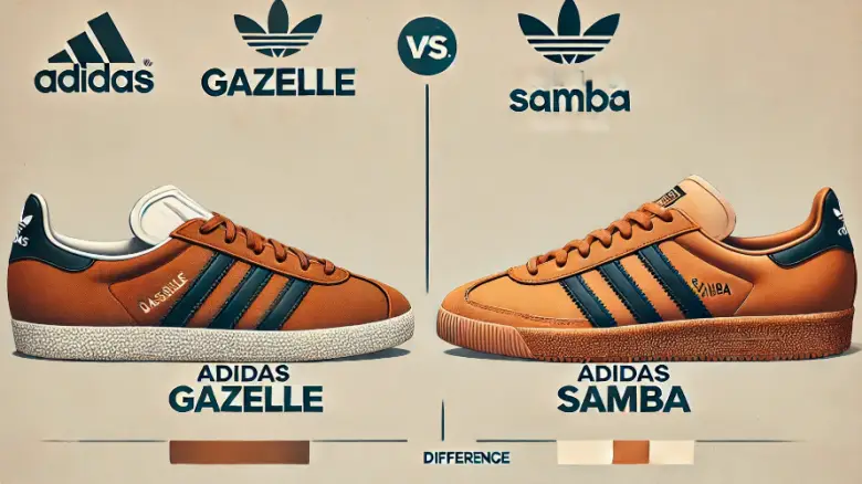 アディダス ガゼルとサンバの違いを比較したイメージ画像。シュータン、ソール、デザインの違いを視覚的に解説しています。