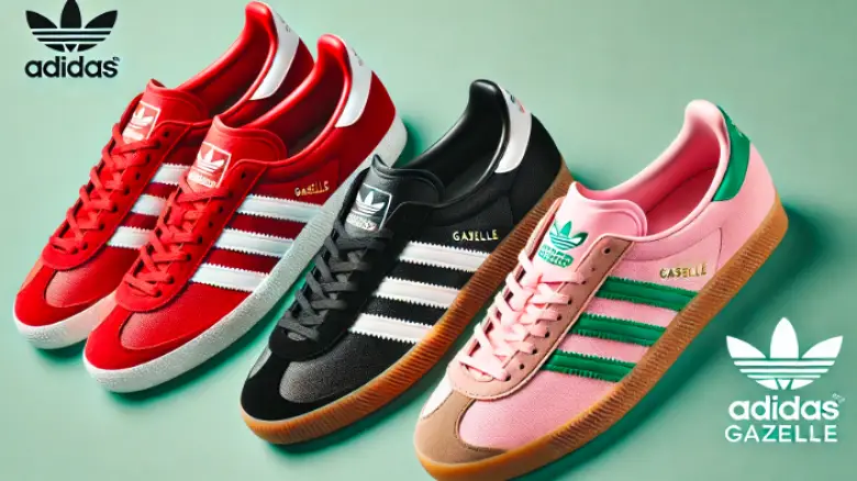 adidasガゼルのカラーバリエーションを紹介。レッド、ブラック、ピンクの3種類がスタイリッシュなデザインで揃っています。