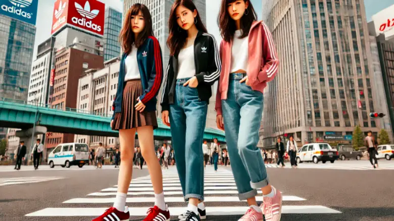 adidasガゼルを履いた3人の女性が東京の交差点でストリートファッションを披露している