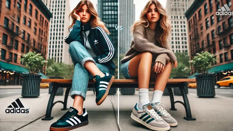 20代女性がアディダス サンバ OGとADVを履き比べ、それぞれの違いをチェック。デザインや履き心地の比較に役立つイメージ。