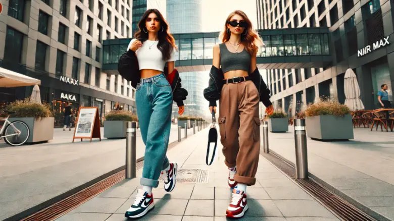 エアマックスを履いた20代女性2人が都会の街を颯爽と歩くストリートファッションスタイル
