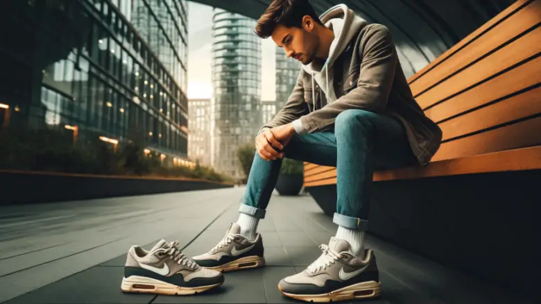 都会のベンチでエアマックスを見つめながら修理を考える20代男性
