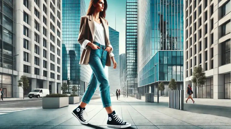 都会的な背景の中、コンバースを履いてスタイリッシュに歩く30代女性。