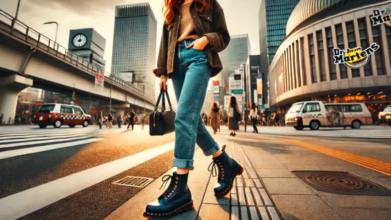 20〜30代の女性が人気のドクターマーチンを履いて、東京の街並みでカジュアルなコーディネートを楽しむ姿。