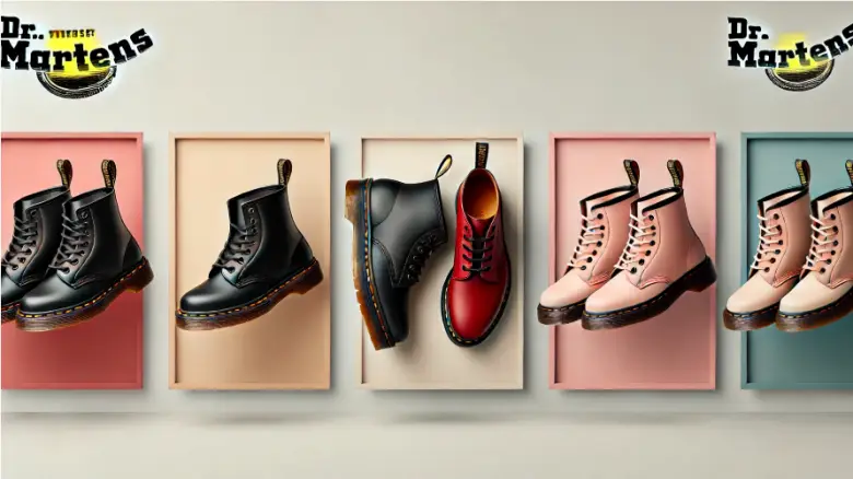 ドクターマーチンのクラシックな3足が横並びに。ブラック、チェリーレッド、そしてモダンなパステルピンクのトレンド感あふれるデザイン。