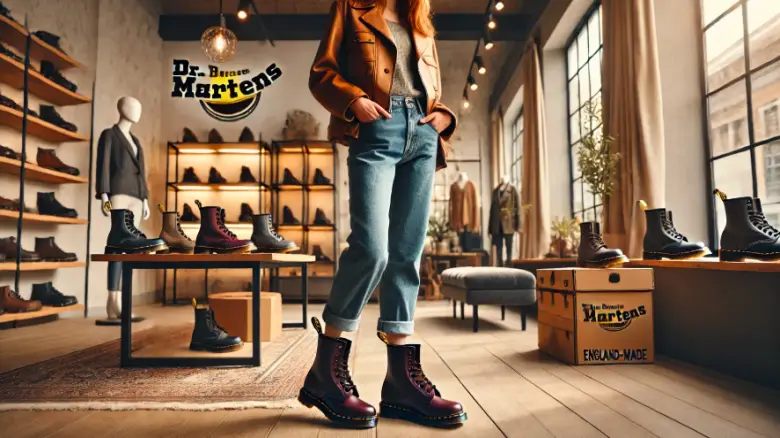 ドクターマーチンのイングランド製ブーツでカジュアルなコーディネートを楽しむ女性。ショップの雰囲気と合わせてチェック!