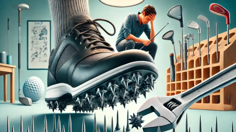 「ゴルフシューズのスパイク交換で困難に直面した場面を再現。専用レンチや工具の重要性を強調するイメージ画像です。」