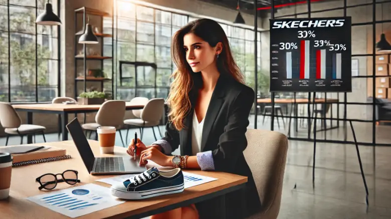 現代的なオフィスでスケッチャーズのシェア率を分析する30代女性。スニーカー市場におけるブランドのポジションに注目。