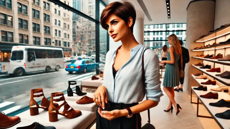 スマートカジュアルでNGな靴を避け、最適な選択を求める30代女性。洗練された店舗で悩む姿が印象的です。