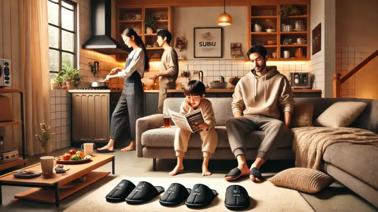 SUBUのスリッパを履いた家族が、リビングでリラックスして過ごすシーン。デザイン性と機能性を兼ね備えたSUBUが日常にぴったり。