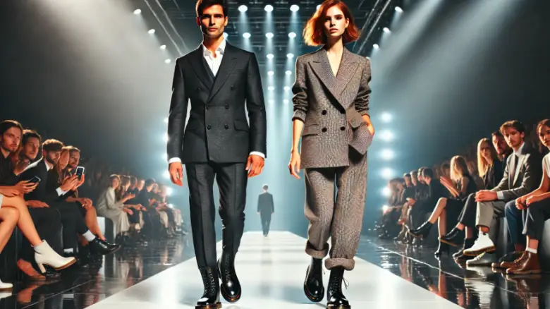30代の男女がドクターマーチンの3ホールシューズを取り入れたスーツコーデを披露。ファッションショーでの洗練されたスタイル。