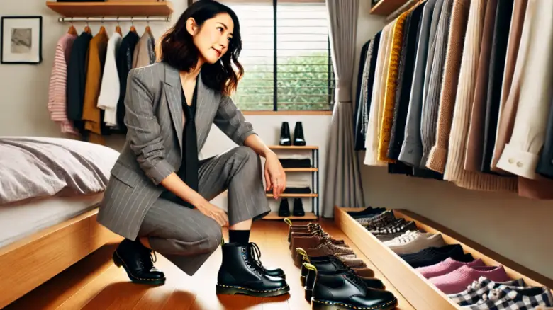 30代の日本人女性が自宅のクローゼットでスーツとドクターマーチンの靴を並べてコーディネートしている様子。