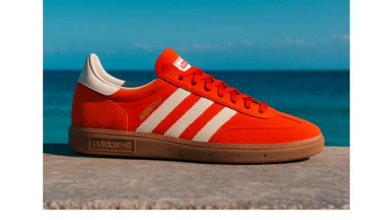 アディダス スペツィアルの人気カラー「オレンジ」、海の背景で映えるクラシックデザイン