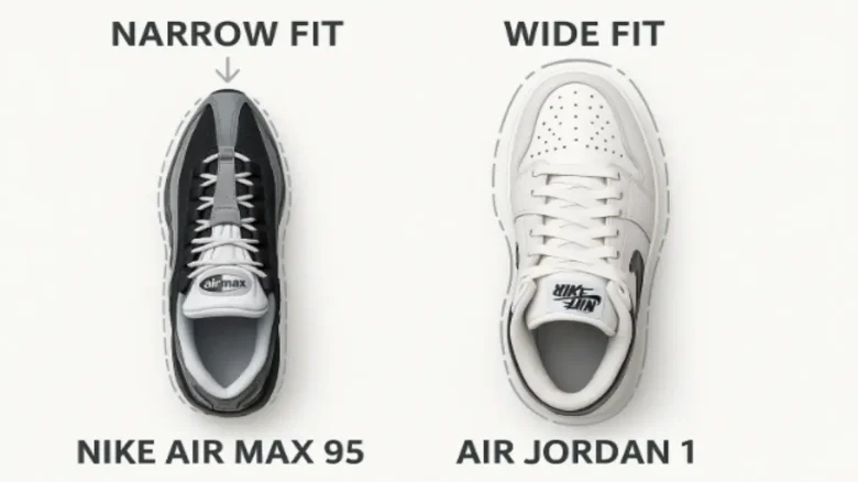 Air Max 95はナローな作り、Air Jordan 1は幅広設計。サイズ選びで失敗しないための比較図。