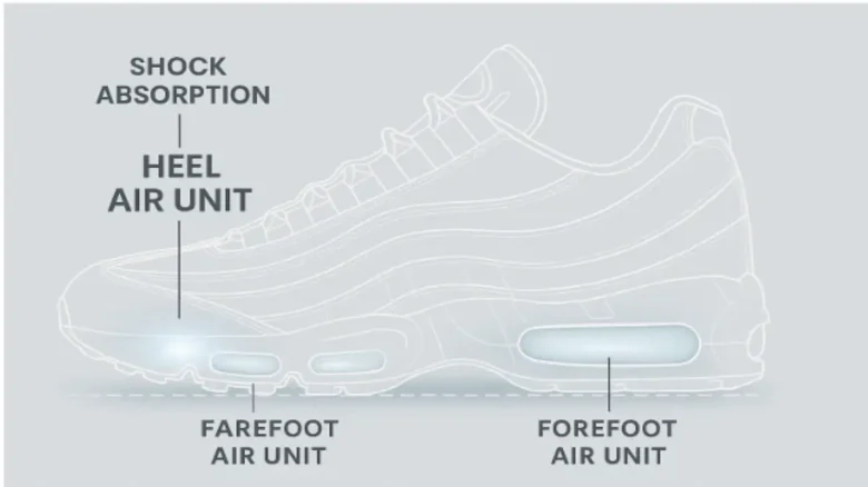 Nike Air Max 95の内部構造が一目でわかる断面図。エアユニットの位置と効果を視覚的に解説。