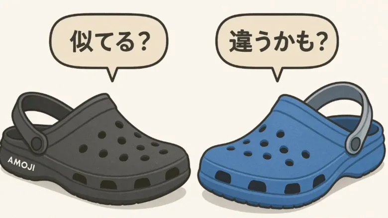アモジとクロックスのサンダルを並べて比較したイラスト。見た目が似ているようで異なるデザインの違いがわかります。
