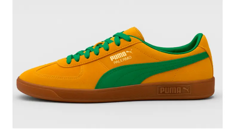 クラシックなデザインが際立つ、プーマ・パレルモのイエロー×グリーンカラーのスニーカー