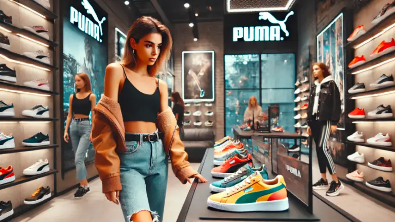 都会的でおしゃれなプーマストアで、カラフルなPUMA PALERMOをチェックする女性