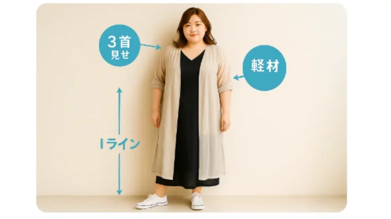 まず基本にしたいのは、Iライン・Aライン・Xラインを活かしたシルエット作りです。ロングカーディガンやジレで縦のラインを強調したIライン、フレアスカートで自然に下半身をカバーするAライン、ウエストマークでくびれを強調するXラインなど、自分の体型に合ったバランスで選ぶのがポイントです。