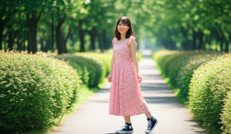 公園の緑に映えるピンクのドット柄ワンピースに、足元は定番の黒コンバースハイカットでカジュアルダウン。可愛らしさと動きやすさを両立した、夏のぽっちゃりさん向けスニーカーコーデです。